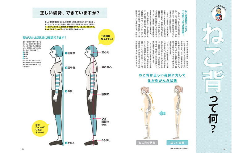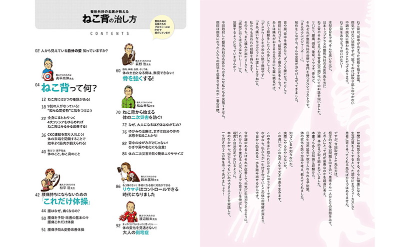 腰痛や脊柱管狭窄症、脊柱側湾症など、今増えている背骨の歪みのもとでもあるねこ背を日常生活のなかで解消していくメソッドを整形外科の名医たちが紹介します。