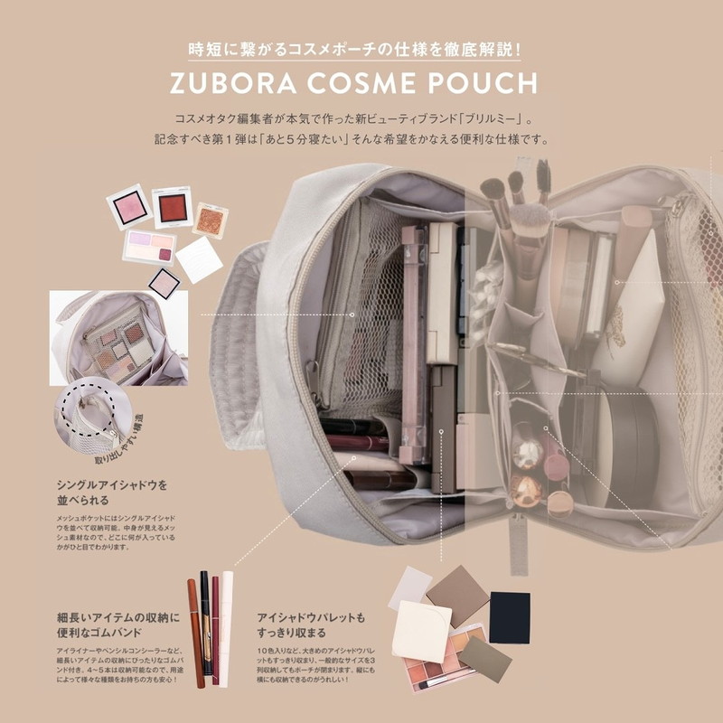 ポーチを閉めた際に背の低いアイテムの上にポケットが重なるので、シルエットもすっきりとした印象に!