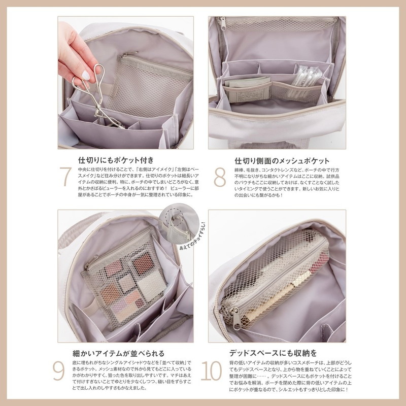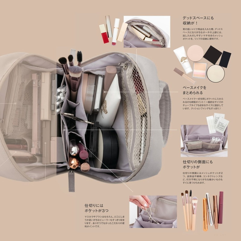 背の低いアイテムの収納が多いコスメポーチは、上部がどうしてもデッドスペースとなり、上から物を重ねていくことによって整理が困難に…… 。