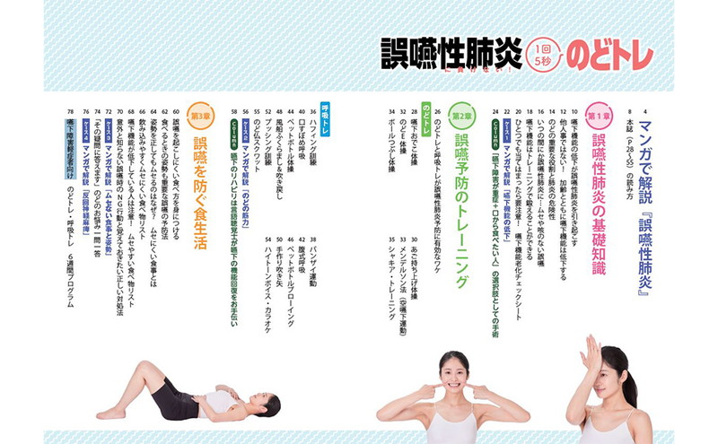 本誌では誤嚥性肺炎の予防ができる、5秒から始められるのどトレ&呼吸トレを紹介。誰でも簡単に実践できる内容です。
