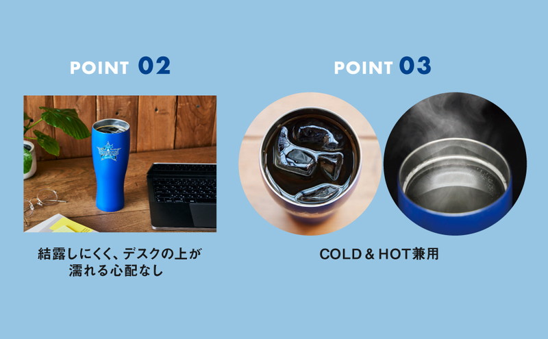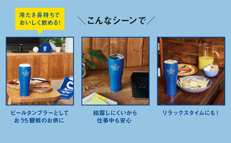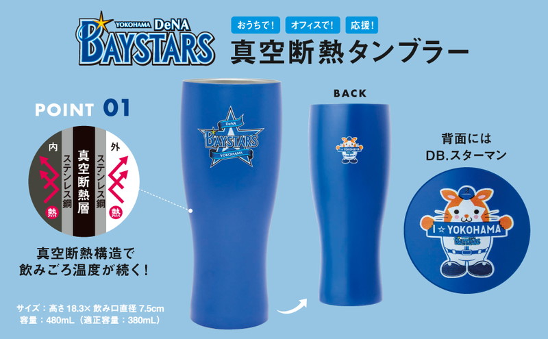 背面には球団の大人気マスコットのDB.スターマンをオン。真空断熱構造で保冷保温効果があり、結露しにくいのも安心。おうちでの野球観戦に、デスクワークに、リラックスタイムに、ぴったりのアイテムです。