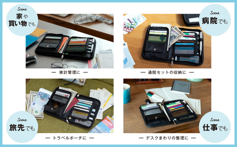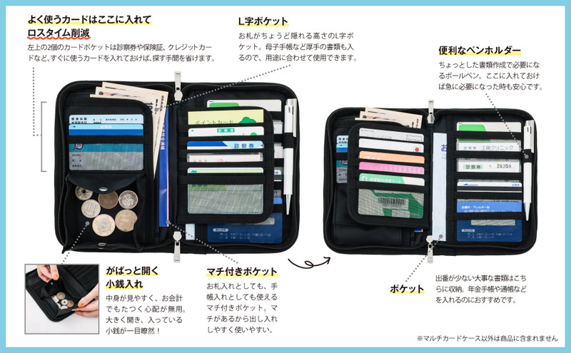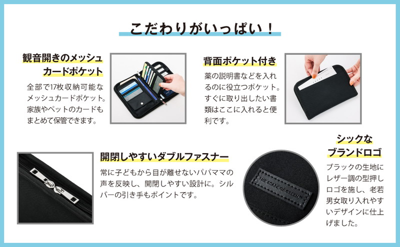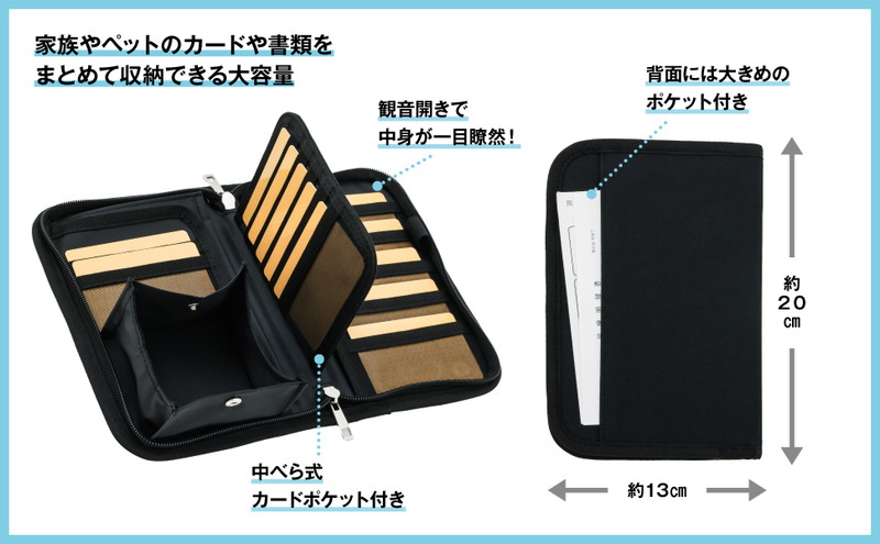 ガバッと開く小銭入れにお札が入るマチあり収納ポケット付きでお財布機能も充実。17個のメッシュカードポケットでおうちでのカード保管はもちろん、お出かけ先でのお会計がスムーズに。