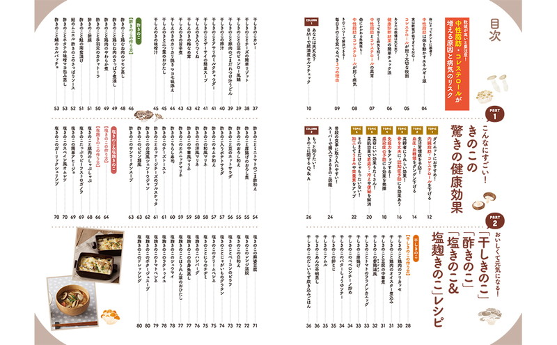 本誌では万病を予防する健康食材「きのこ」を「干しきのこ」「酢きのこ」「塩きのこ」「塩麹きのこ」という使いやすい4種の“おかずのもと”にします。
