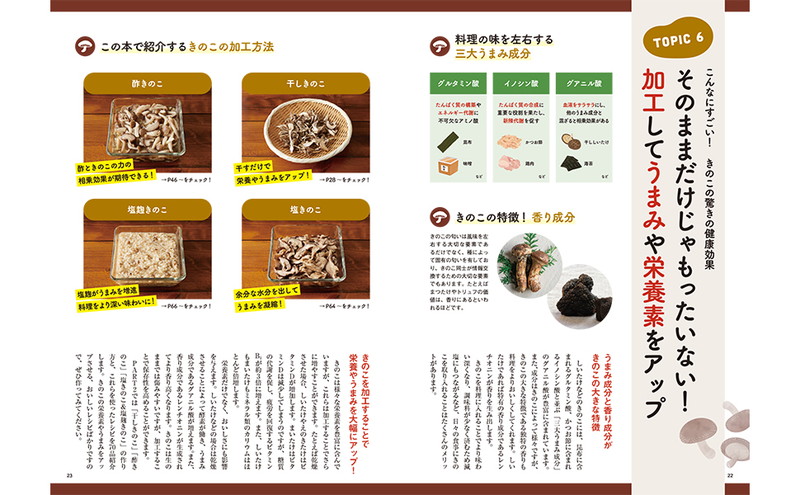 シンプルにそのまま食べるのはもちろんきのこは干したり、加工することでよりおいしく食べることができますので、ぜひ本書のレシピを参考にしながら日々の食生活にきのこを取り入れていただければと思います。