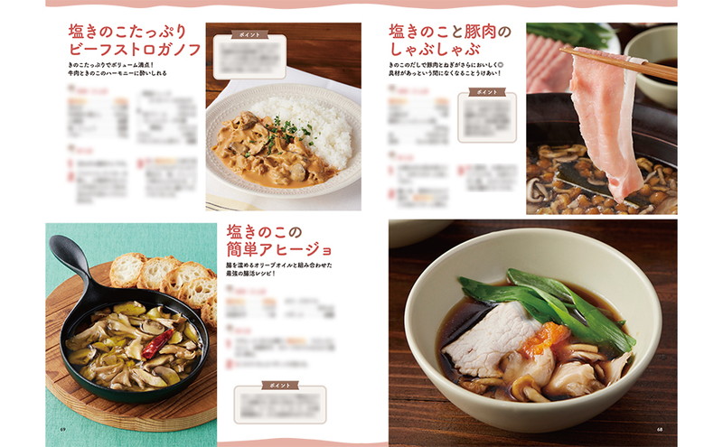 塩きのこと豚肉のしゃぶしゃぶ、塩きのこの簡単アヒージョ、塩きのこの麻婆豆腐、塩麴きのこハンバーグ、塩麴きのこのシュウマイ、塩麴きのこのポタージュスープ etc.