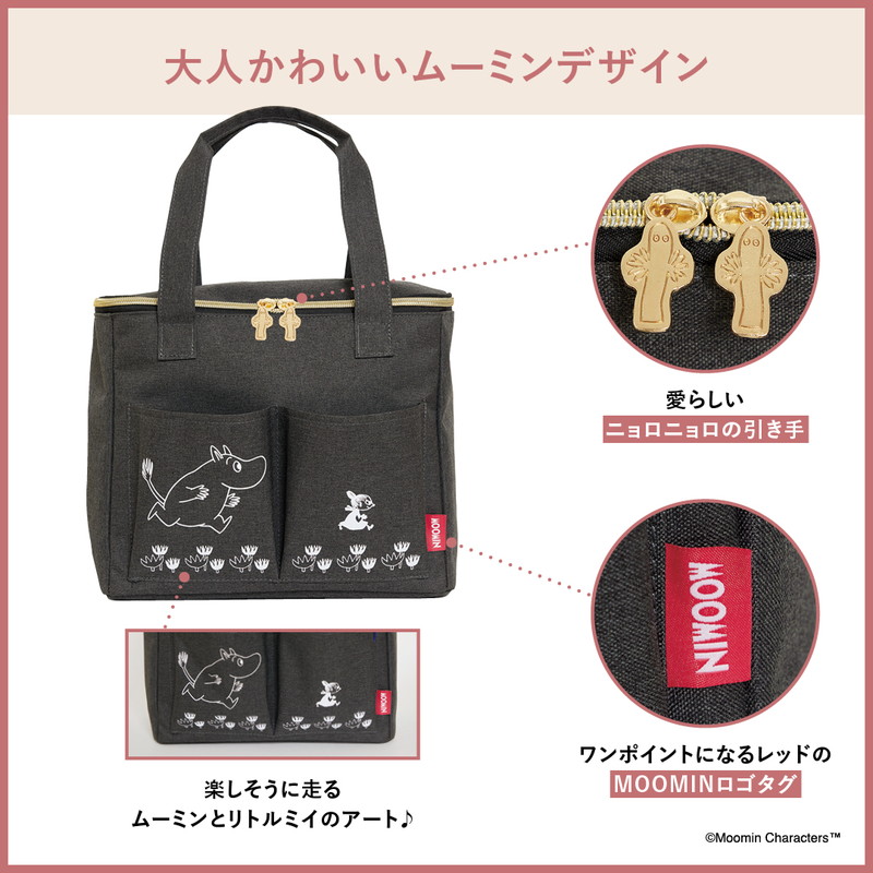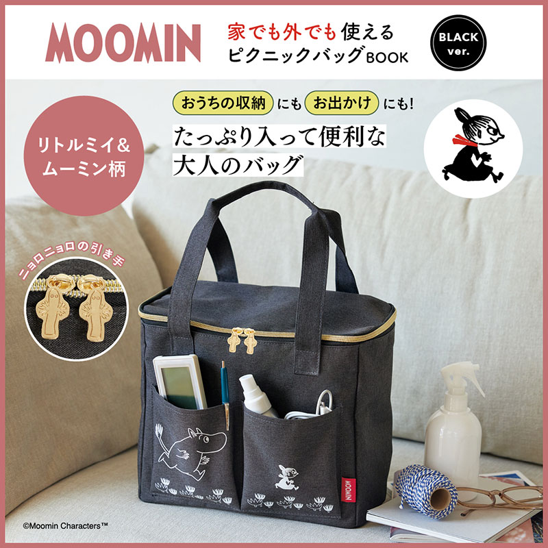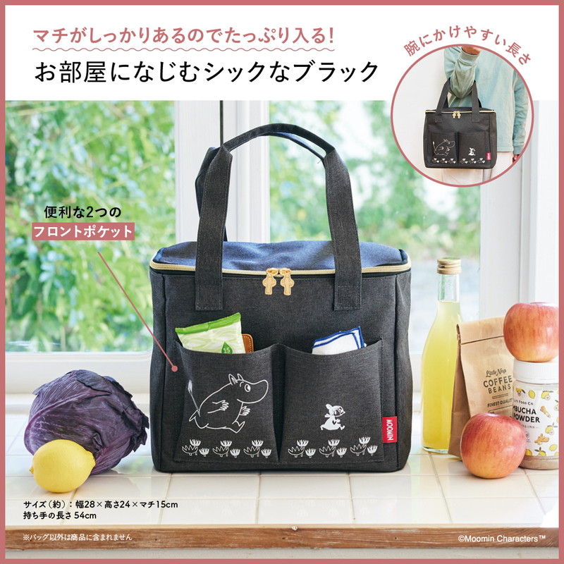 どんなシーンにもなじむシックなブラックがおしゃれな、ムーミンデザインのピクニックバッグが登場しました。マチがしっかりあるので、見た目以上にたっぷりとものが入ります。2つのフロントポケットには、ペンやハンドタオルなどの小物を仕分けて収納できて便利。持ち運びしやすいサイズ感と、腕にかけるのにちょうどいい長さの持ち手がうれしい♪
