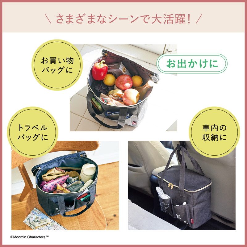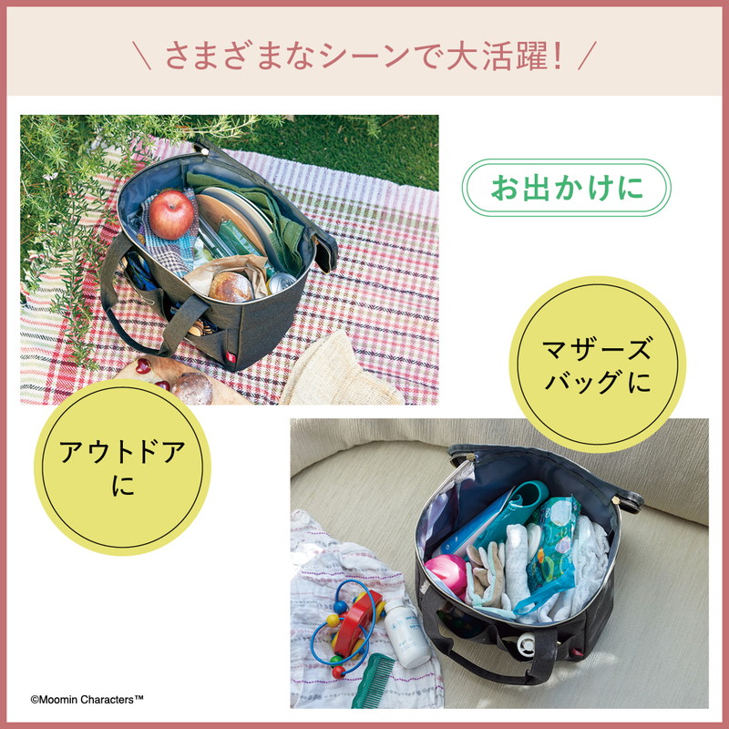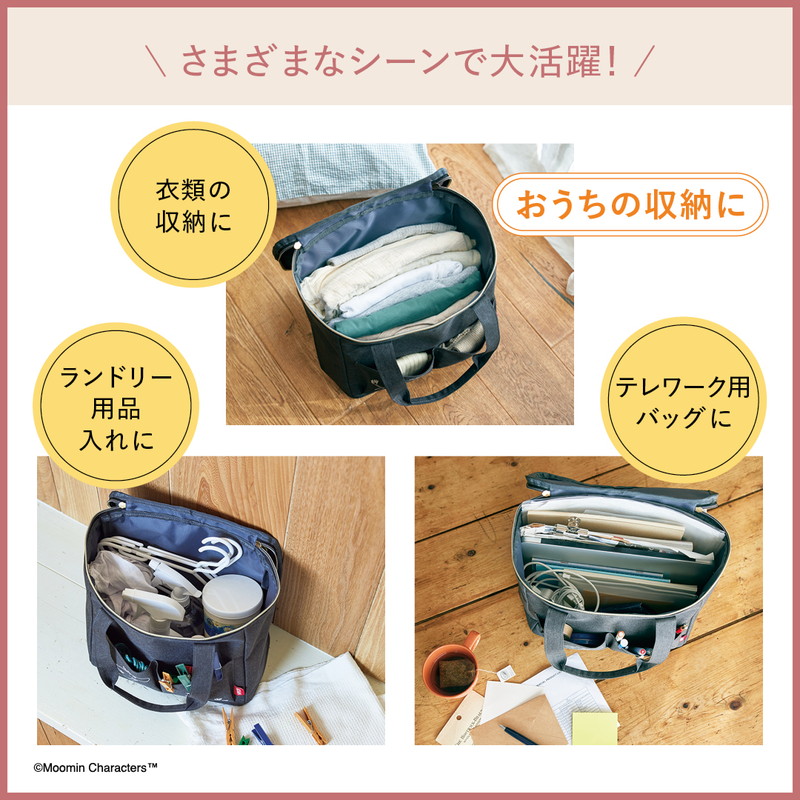 大容量なのでリビング雑貨やおもちゃ、衣類などの収納はもちろん、アウトドアやマザーズバッグ、お買い物や旅行など、お外でも大活躍。マルチに使えて、さまざまなシーンで頼りになるムーミンバッグです。