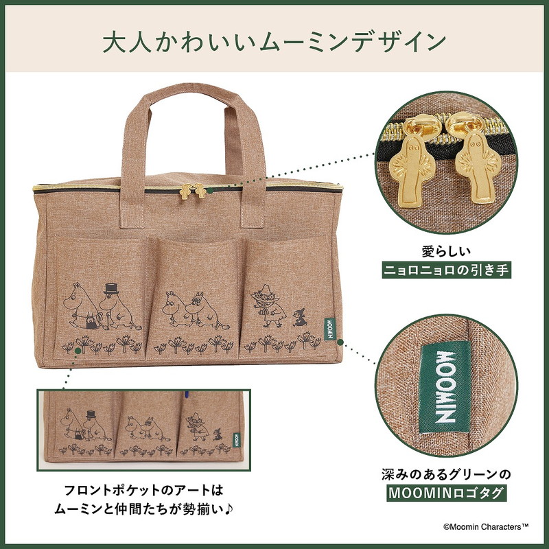 お部屋になじむナチュラルなベージュカラーがおしゃれな、ムーミンデザインのピクニックバッグが登場しました。BIGサイズでマチがしっかりあるので、たっぷりとものが入ります。3つのフロントポケットには、ペンやハンドタオルなどの小物を仕分けて収納できて便利。持ち手は腕にかけるのにちょうどいい長さで、持ち運びしやすいのがうれしい♪