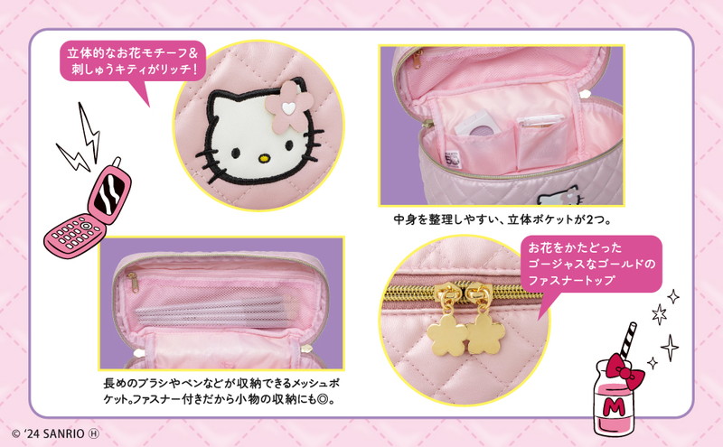 お花をかたどったゴールドのファスナートップや、立体的なお花モチーフのついた刺しゅうのキティなど、ディテールにもこだわりました。