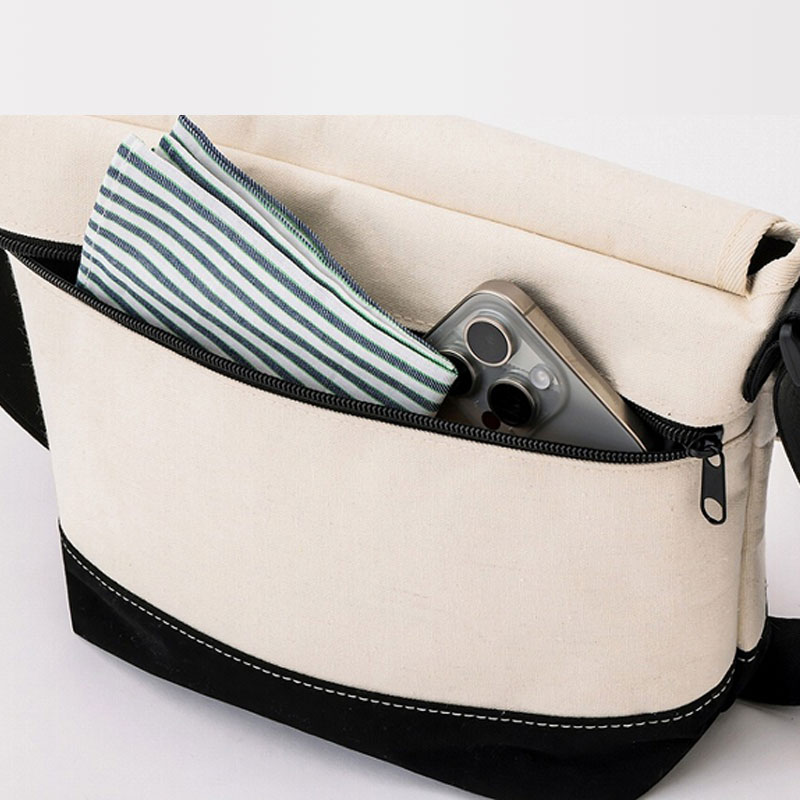 白とブラックの丈夫な帆布風生地で仕立てたバッグは、コーディネートに爽やかさをプラス。