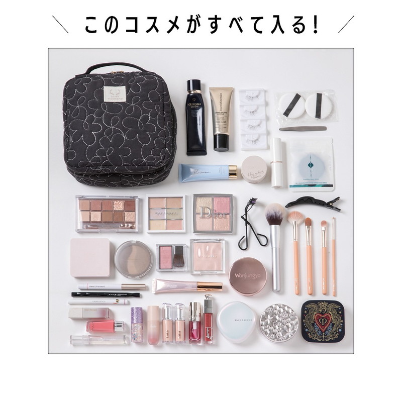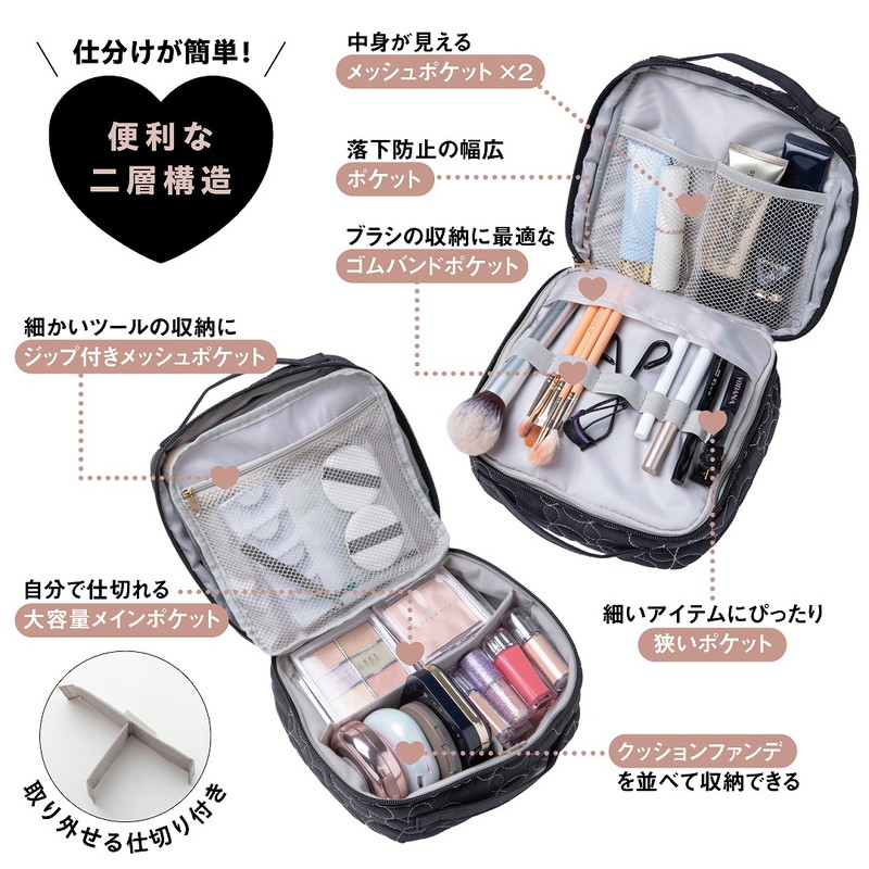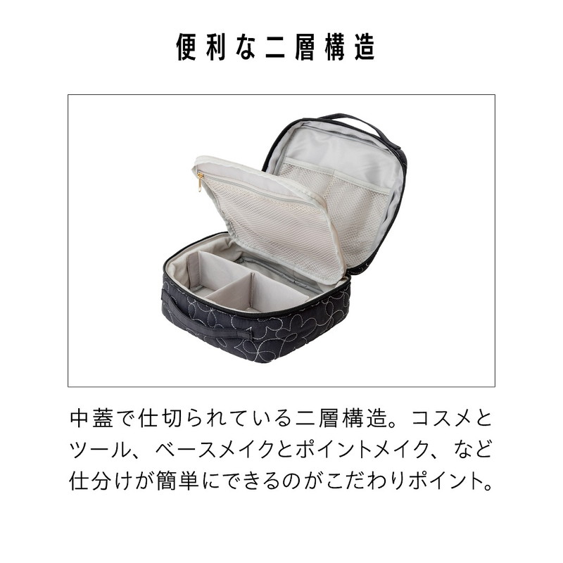 中蓋で仕切られている二層構造。コスメとツール、ベースメイクとポイントメイク、など仕分けが簡単にできるのがこだわりポイント。