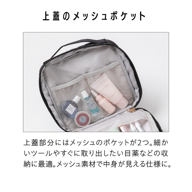上蓋部分にはメッシュのポケットが2つ。細かいツールやすぐに取り出したい目薬などの収納に最適。メッシュ素材で中身が見える仕様に。