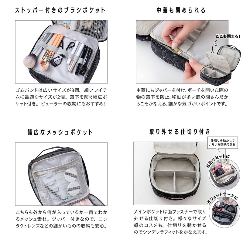 メインポケットは面ファスナーで取り外せる仕切り付き。様々なサイズ感のコスメも、仕切りを動かせるのでシンデレラフィットをかなえます。