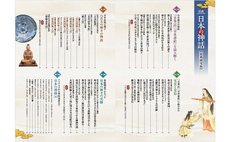 本誌では『記紀神話』のほか、各地の神話を伝える『風土記』、権力闘争に敗れた古代豪族の祖先神を描いた『古語拾遺』や『先代旧事本紀』などを網羅。
