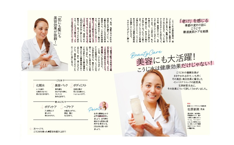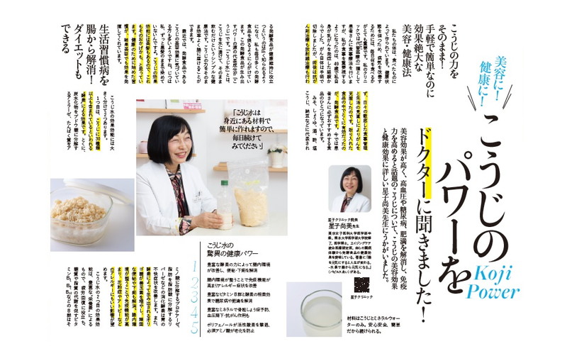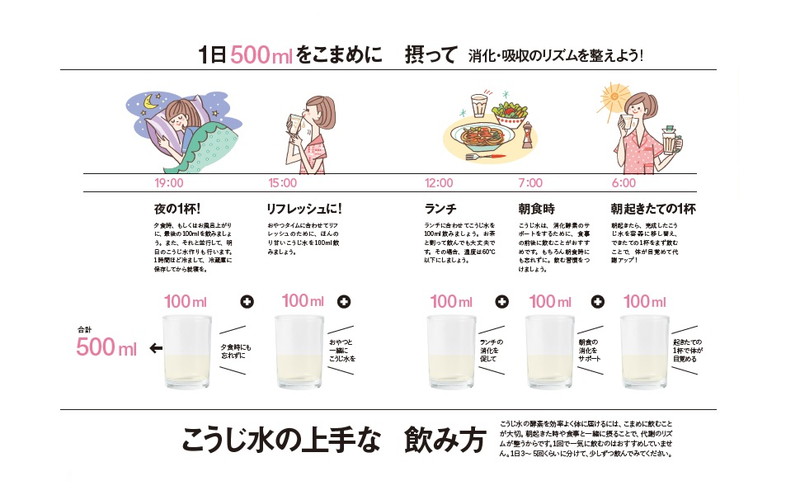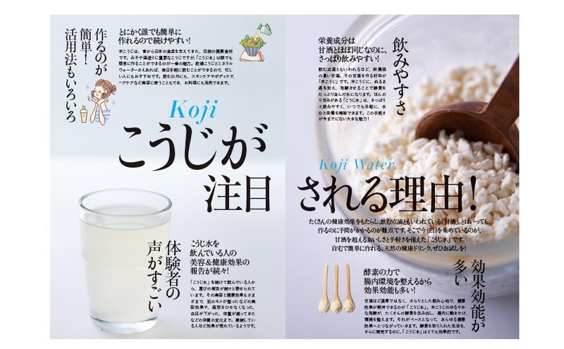 こうじをひと晩水に漬けるだけで完成する“こうじ水”。このこうじ水には、免疫力アップやがん予防をはじめ、高血圧予防、腸内環境改善、肝機能値改善、糖尿病予防など、体の不調を整える効果がたくさん。簡単に作れて、ほんのり甘くてさらっとした飲み心地なので、毎日続けられます! 酵素やアミノ酸、ビタミンB群、カルシウムなどの栄養もたっぷり含まれた、魔法の健康ドリンクです。毎日1杯飲んで健康寿命を延ばしましょう!