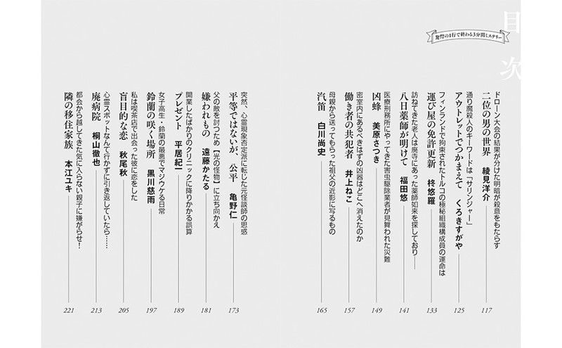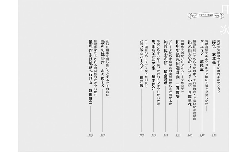 ドラマ「主婦たちの完全犯罪」に触発され企てた殺人計画は、誰にもバレないはずだったが……(倉井眉介「味方のいない完全犯罪」)。 田中が死ぬたびにタイムリープが発生!? 果たして俺はこのループから抜け出せるか(三日市零「田中突然死回避計画」)。 その他、誰も出した覚えのない特許使用許可の謎や、互いに相手を出し抜こうとする双子の姉妹の話など、ショート・ミステリー全36編収録。