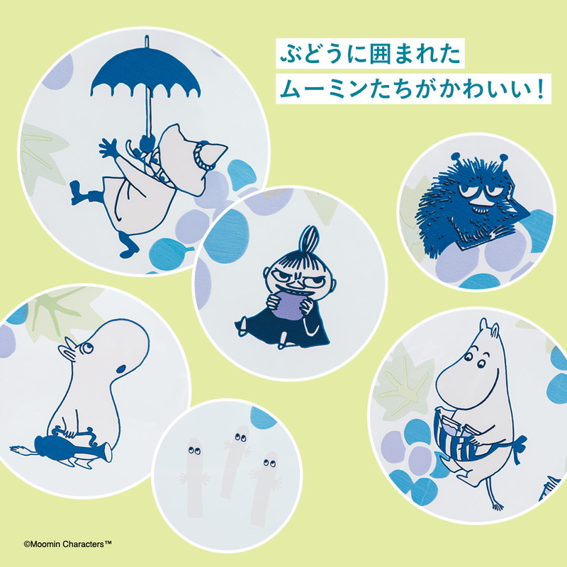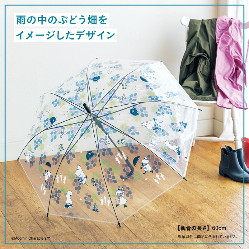 ローソンで大人気を博したムーミンの傘に、待望の新柄が登場です! 雨のぶどう畑をイメージしたデザインで、ぶどうをかじっていたり、ぶどうからひょっこり顔をのぞかせたり、ムーミンたちの気ままで愛らしい姿にほっこり。落ち着いたカラーリングで大人のコーデにぴったりです。
