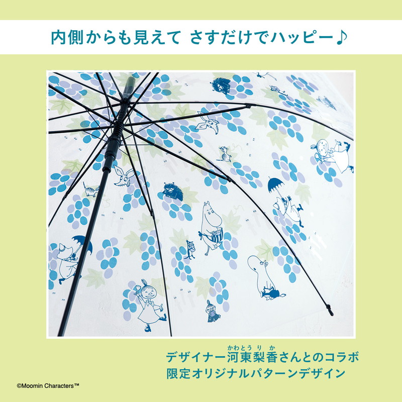限定オリジナルパターンのデザインは、ムーミンのテキスタイルも数多く手がけるテキスタイル・インテリアデザイナーの河東梨香さんとのコラボ。傘をさした内側からもかわいいムーミンと仲間たちがしっかり見えて、雨が降っていても気分が上がります♪