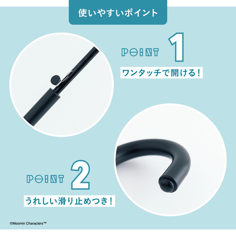 ボタンを押すだけのジャンプ式で、荷物が多く手がふさがっているときでも、片手でさっと傘を開ける頼もしい仕様。ハンドルの先には滑り止めがついているので、机などに引っ掛けるときも傘が何度も滑り落ちるストレスがありません。