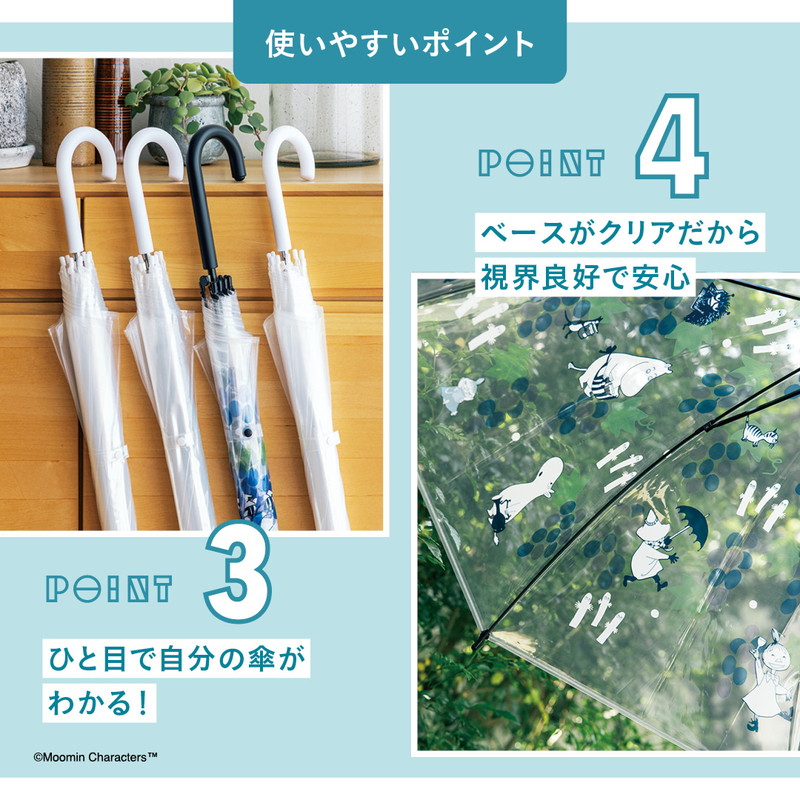 シンプルなビニール傘は間違って持っていかれてしまうこともありますが、このムーミンデザインの傘なら、ひと目で自分の傘を判別できて便利! また雨風をしのぐために傘を体の前に傾けても、ベースがクリアなので視界良好、安心して使えます。