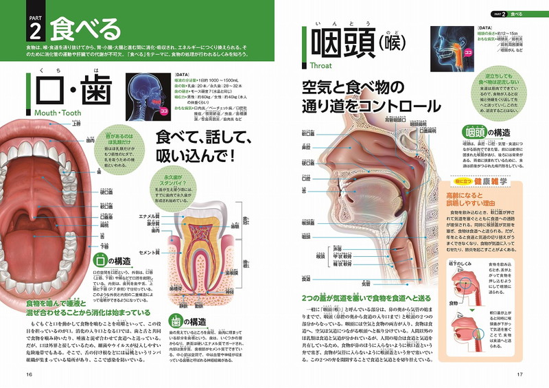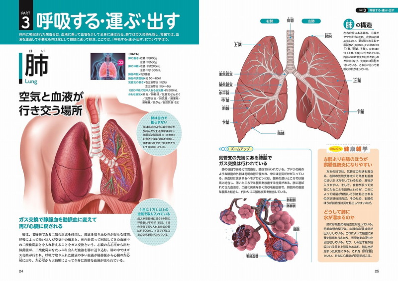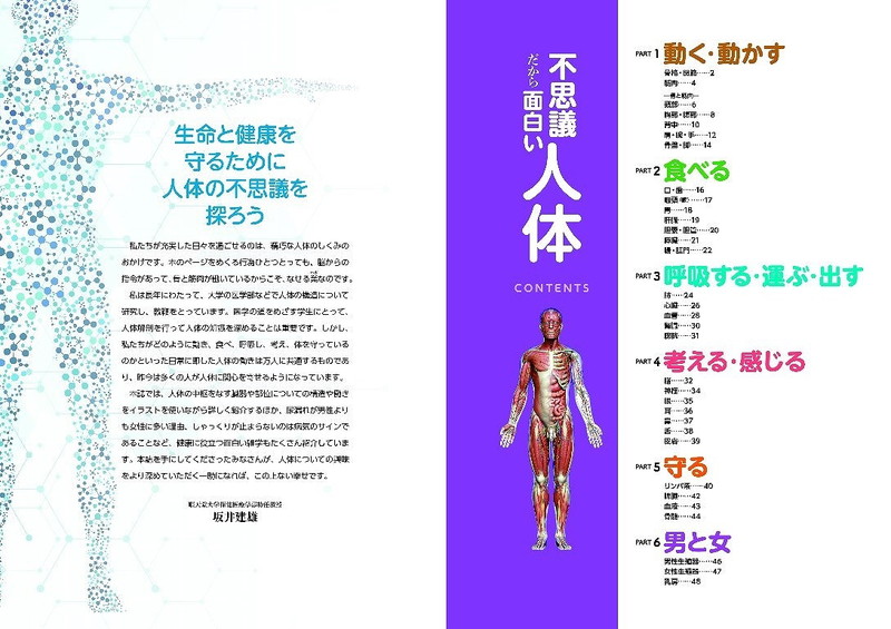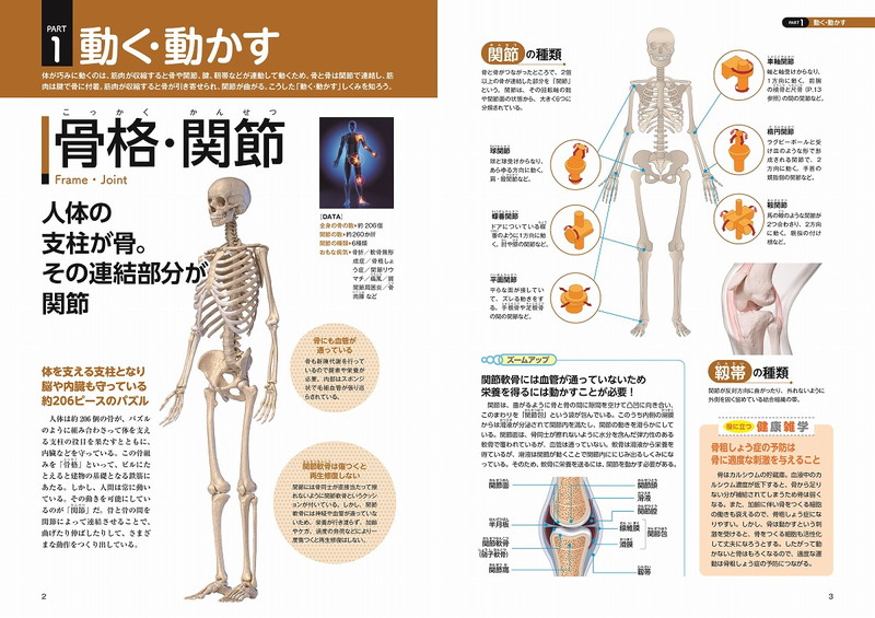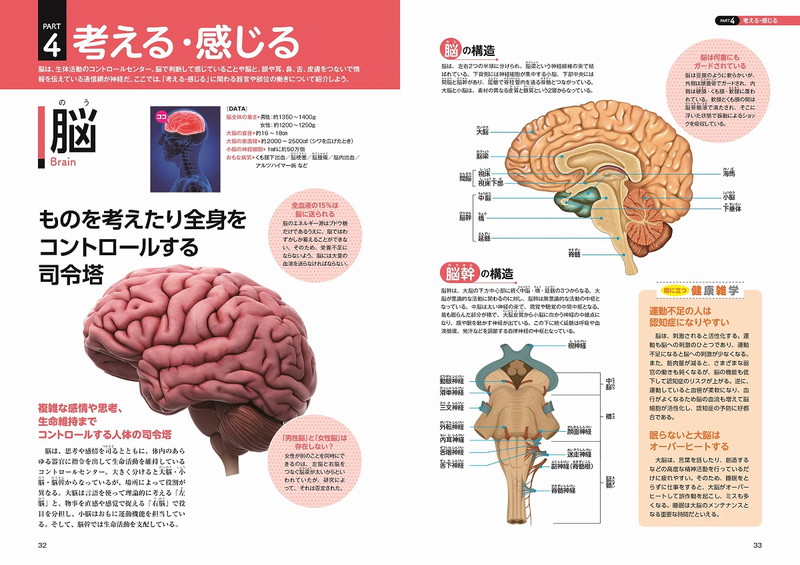 「神経の伝達スピードは毎秒120m」「我慢したおならは口から出る」など、思わず人に話したくなる人体の面白トリビアとともに、骨、筋肉、臓器の構造と機能をビジュアルメインで解説。あたり前すぎて、普段あまり意識しない「からだのしくみ」について、改めて知ることで健康や美容に役立つ!!