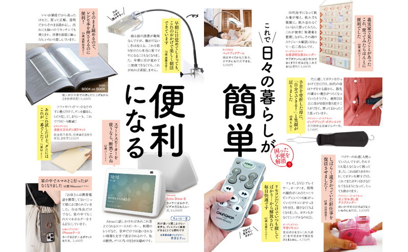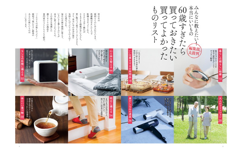 「60歳・100のこと」シリーズ初の番外編は、年を重ねたら手元に置いておきたいアイテムを紹介します。日々の暮らしをラクにする便利グッズはもちろん、将来使うかもしれない、杖や手元スピーカーなども紹介します。