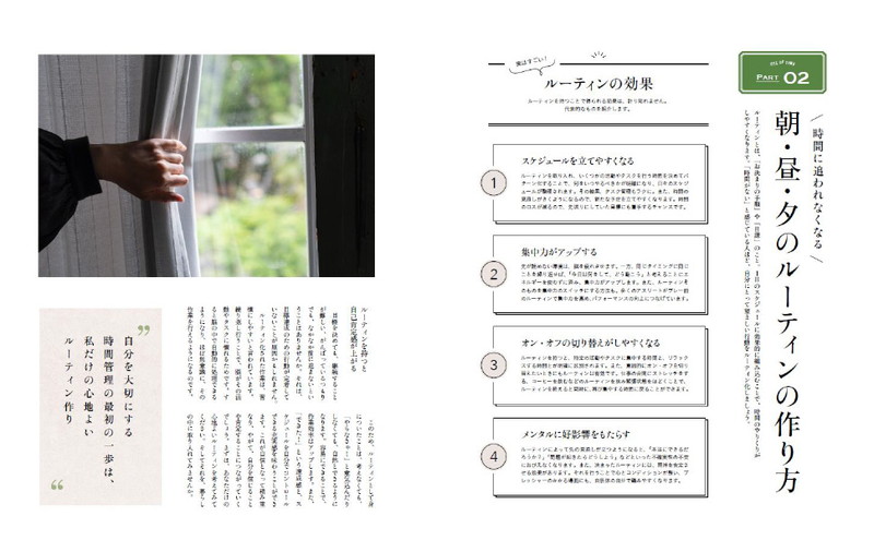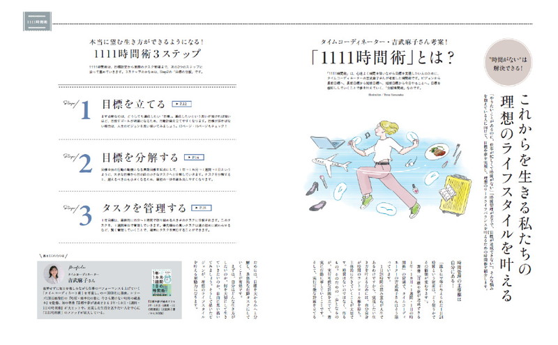 この本では、時間の専門家であるタイムコーディネーター・吉武麻子さんが考案する、夢や目標を叶えるための「1111時間術」をはじめ、自分を幸せにする時間の使い方を知る方々の、かけがえのない日常や、時間を生み出す工夫などをご紹介。