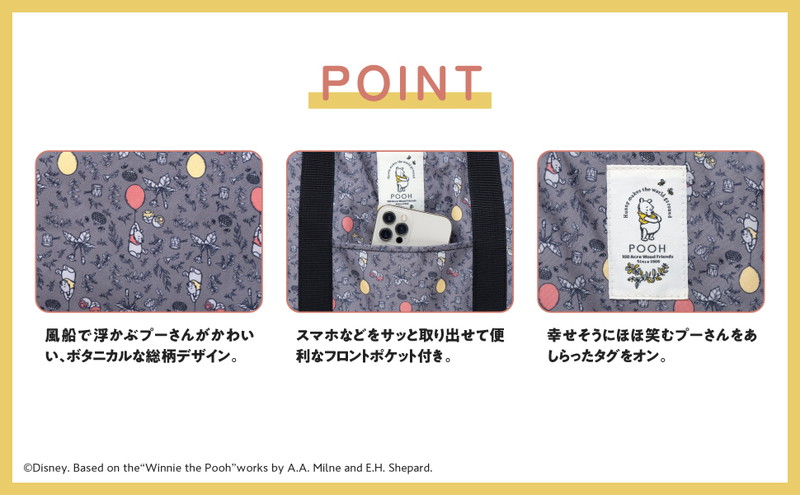 『プーさんとはちみつ』をモチーフにしたボタニカルな総柄デザイン。フロント部分には幸せそうにほほ笑むプーさんをあしらったタグをオン。暮らしになじむ、くすみカラーがおしゃれ。