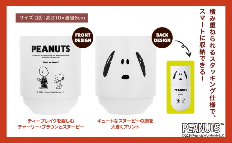 前面にはコーヒーを楽しむチャーリー・ブラウンとスヌーピーの仲良しイラスト、後面にはスヌーピーの顔が大きくプリントされていて、どこから見てもかわいいデザイン。