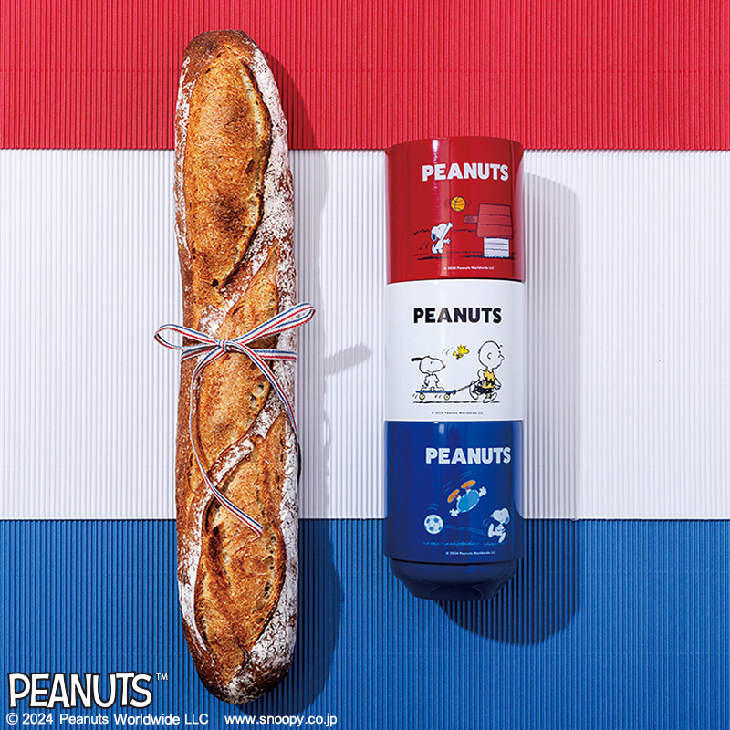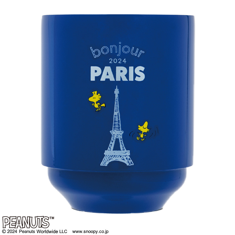 前面にはスポーツを楽しむスヌーピーのイラスト、後面にはエッフェル塔とウッドストックがプリントされているかわいいデザイン。