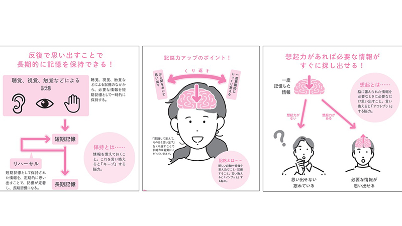本誌では、記憶のプロセスである「記銘」(覚える)、「保持」(忘れない)、「想起」(思い出す)のそれぞれを強化。