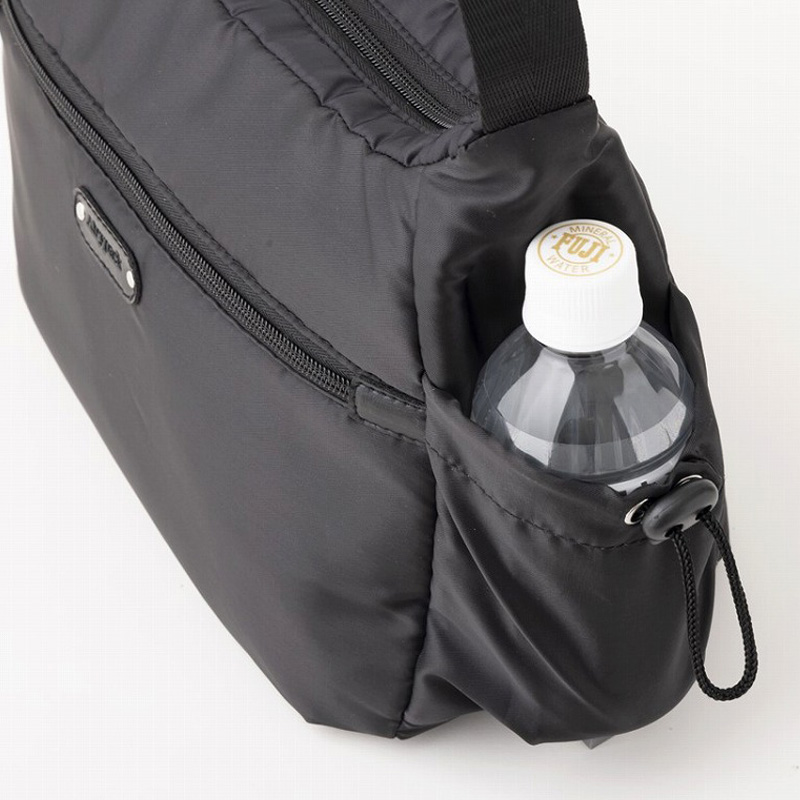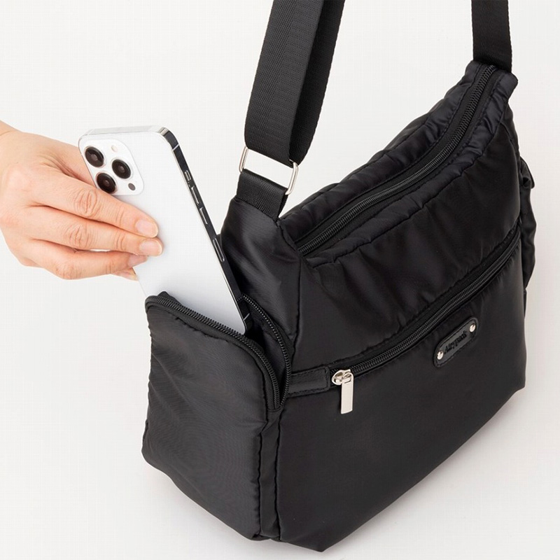整理しやすい内外合計8つのポケットがついていて、また高級感のあるサテン調の生地とレザー調のタグなど使用したデザインとなっています。