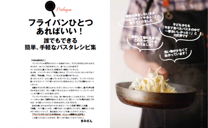 Instagramでフォロワー24万人を超える大人気のワンパンパスタアカウント「ラク短おうちパスタ@きみさん」初のレシピ本が登場。