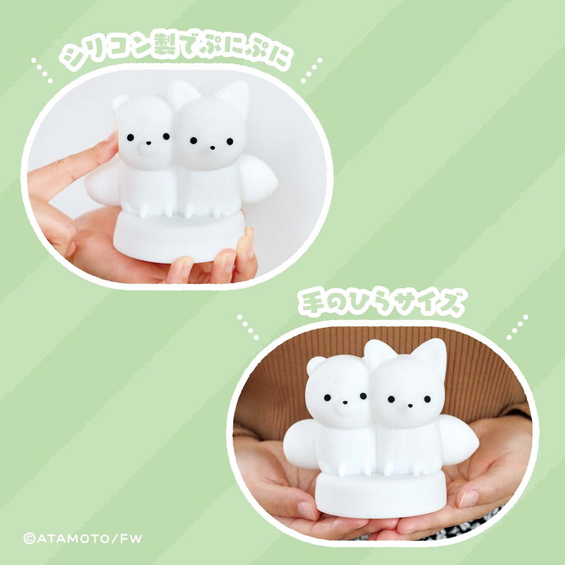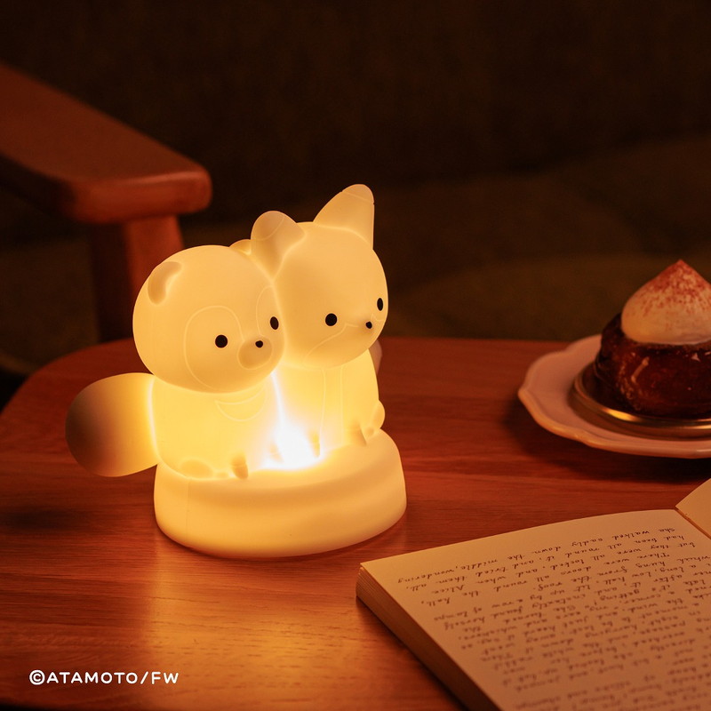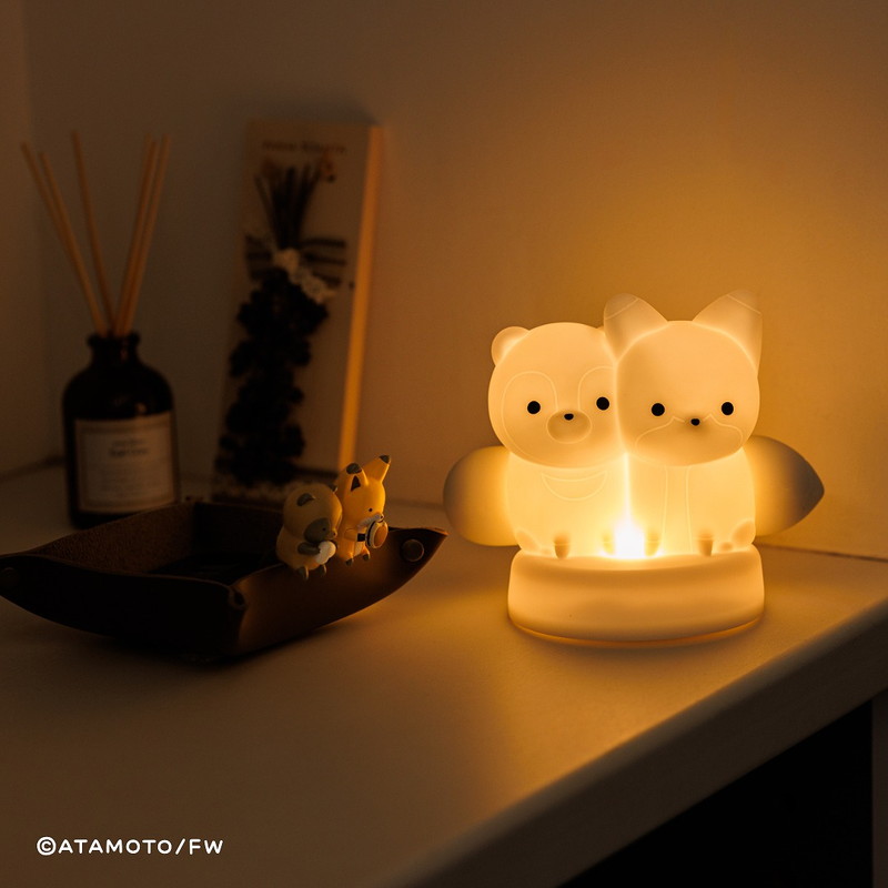 タヌキとキツネらしいぷにぷに触感のシリコン製。あたたかく灯る電球色でお部屋をやさしく照らしてくれます。