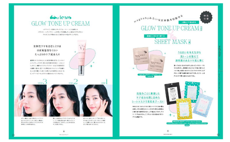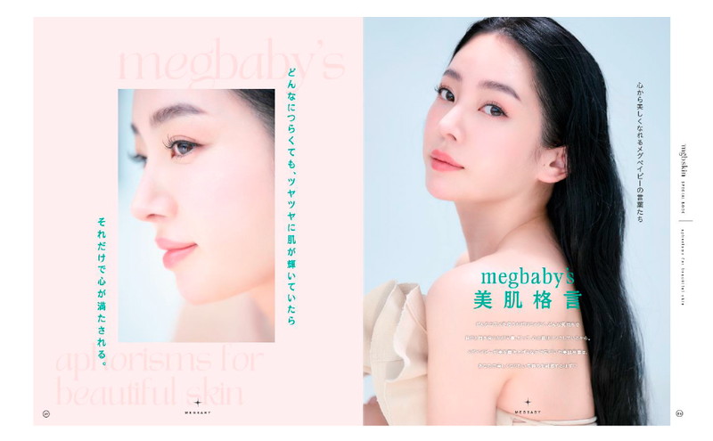 誌面では、mgb skinのブランド説明やフルラインナップ紹介、megbabyの美肌の歴史や心から美しくなれる美肌格言などを掲載!