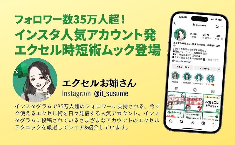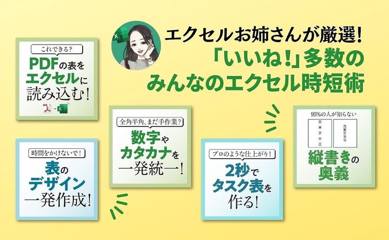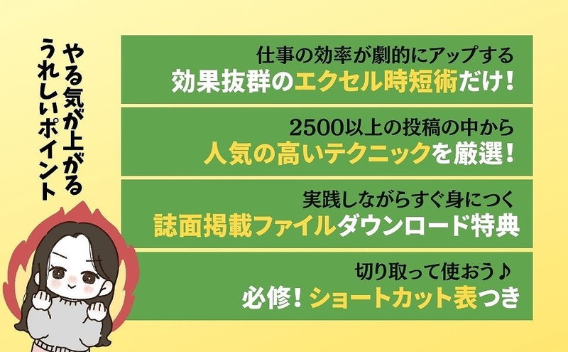 インスタグラムでみんなが発信しているエクセル時短術を日々シェアし、35万人超がフォローする「エクセルお姉さん」が、「いいね!」をたくさん獲得した効率が上がる時短術を厳選紹介します。読者限定の誌面掲載ファイルのダウンロード特典と、便利な切り取り式の必修ショートカット表つき。