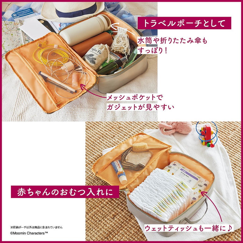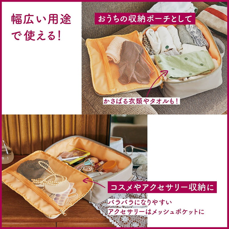 旅行やお出かけにはもちろん、おうちでコスメや雑貨を収納したり、インナーやミニタオル類などクローゼットの整理整頓に使ったり、赤ちゃんのおむつなどを入れるマザーズポーチにしたりなど、幅広い使い方ができるマルチなビッグポーチです。