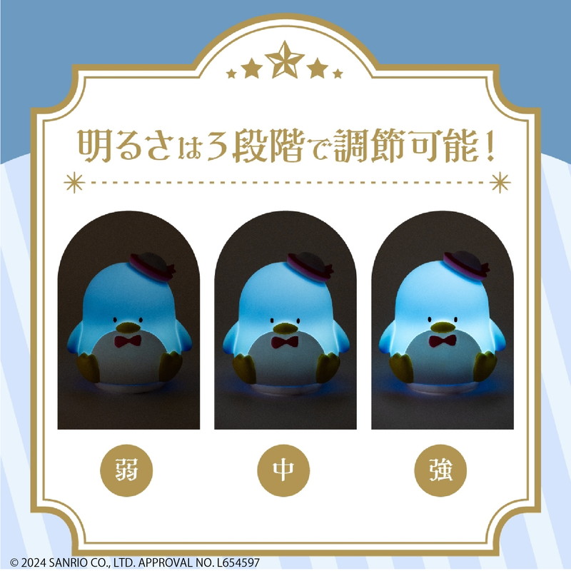 サンリオの人気者であり、「はぴだんぶい」のメンバーでもあるバッドばつ丸、けろけろけろっぴ、タキシードサムが揃ってかわいいお部屋ライトに!