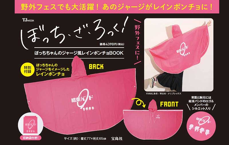 後藤ひとりが着用しているピンク色のジャージをモチーフにしたレインポンチョが登場。野外フェスやアウトドア、レインシーンなどで大活躍間違いなしのアイテムです。