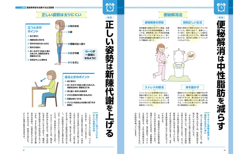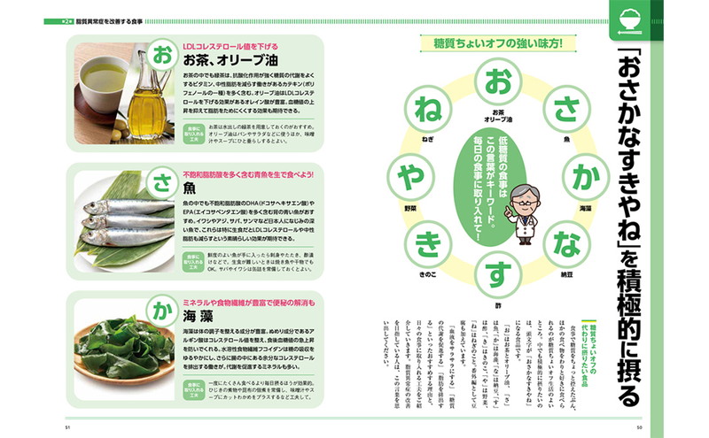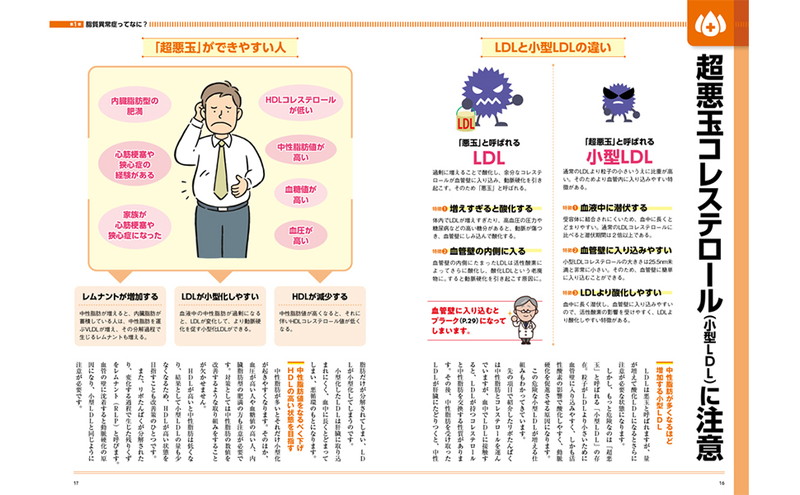 脂質異常症は自覚なく血管をむしばみ、動脈硬化を確実に進行させ、脳梗塞、心筋梗塞など突然死とつながる恐ろしい症状です。現在予備軍を含め約3000万人いるといわれています。疑いも含めれば50代以上の4人に1人とも。加齢も要因のひとつです。血液中の脂質は全身をめぐる血管の健康と深く関連があります。本誌では脂質異常症の原因、対策、改善する食べ物、食べ方、生活習慣を豊富なイラスト、図版とともにご紹介します。