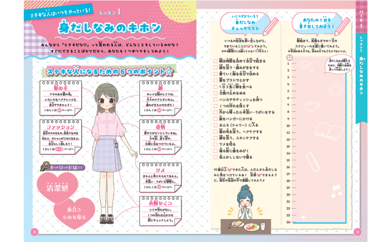 お食事をいただくときのマナー、いま自分が着たいファッション、身だしなみや気持ちの整えかたなど、「すてきな人になる」ためのレッスンを、豊富で可愛らしいイラストとともに解説します。