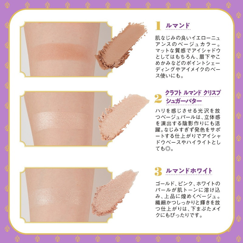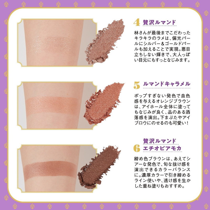 ルマンドシリーズの生地をイメージしたブラウンやオレンジを中心とした6色で、マットな質感からツヤッとしたパール、キラキラのラメまで、これ1つで様々なメイクスタイルを楽しめます。