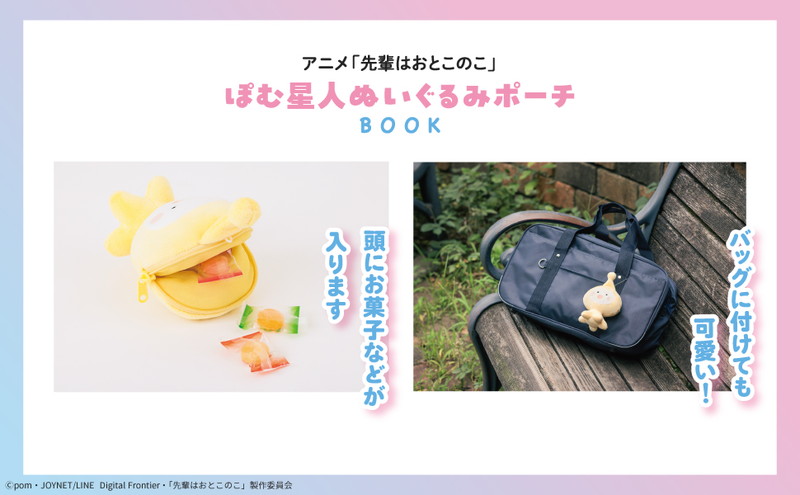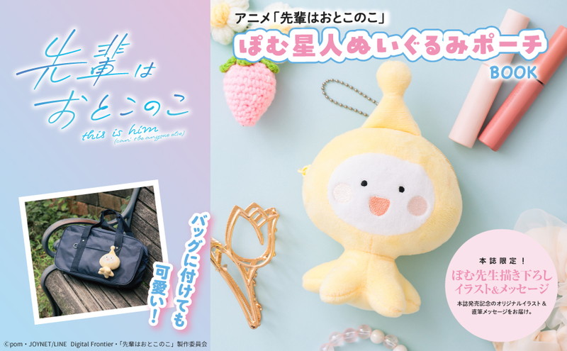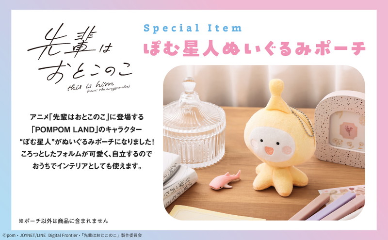 アニメ化を記念した本誌のスペシャルアイテムは、アニメにも登場する「POMPOM LAND」のキャラクター「ぽむ星人」のぬいぐるみポーチです。