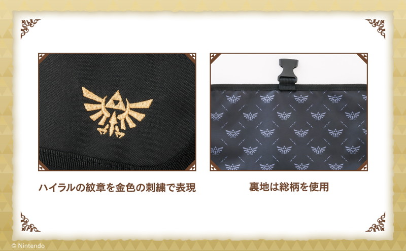 黒字にゴールドの刺繍が映えるデザインで、裏地にはハイラルの紋章の総柄があしらわれています。