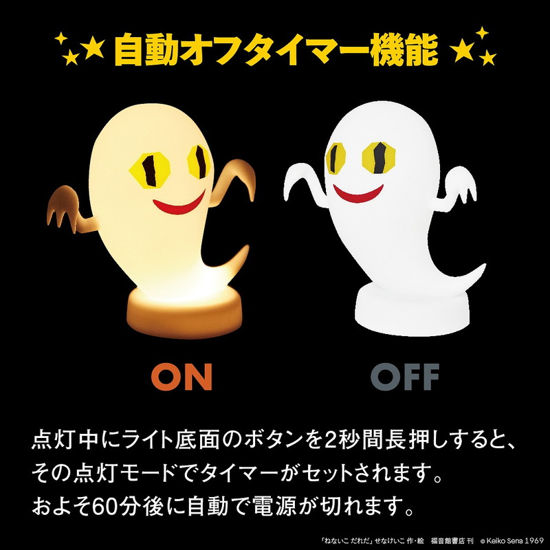 ゆっくり明滅するやすらぎモード、素早くチカチカする点滅モード、そして自動オフタイマー付き。 360°どこから見てもおばけのフォルムを再現したお部屋ライトは昼間はオブジェとして飾ってもよし。