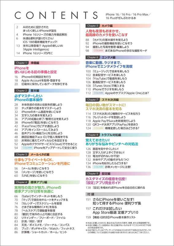 【NTTドコモ、au、ソフトバンク、楽天モバイル、格安SIM対応】iPhone 16、16 Plus、16 Pro、16 Pro Maxの基本操作はもちろん、標準アプリの使い方から、キャッシュレス決済、データの共有やバッテリーの無駄な消費を防ぐ方法、便利アプリの紹介など、快適に使うための活用方法まで、まるごと解説します。iPhone 16シリーズだけでなく、iOS 18を搭載するすべてのiPhoneに対応した解説書です!