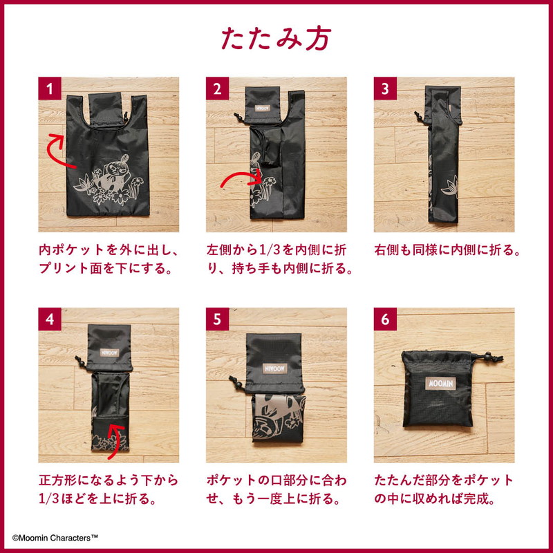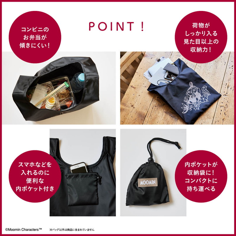 シンプルなブラックにリトルミイのイラストがおしゃれなショッピングバッグは、かわいいだけでなく使い勝手も抜群です♪ たっぷり大きなマチなので、しっかり収納できるのはもちろん、お弁当などが傾きにくく、コンビニなどのお買い物にもぴったり。しかも、小物を入れるのに便利な内ポケットが収納袋になるポケッタブル仕様。手のひらサイズに折りたたむことができます。