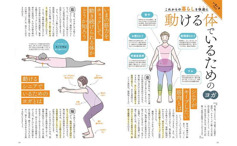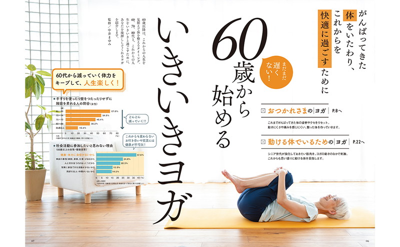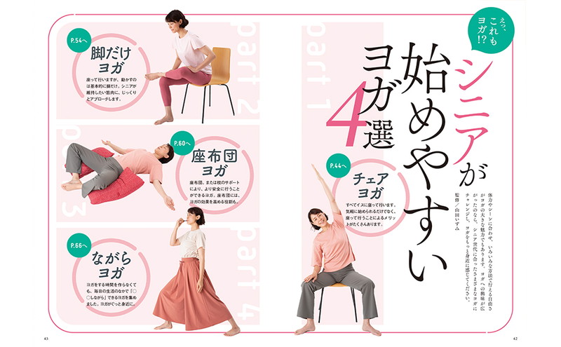 シニア女性向けに「いつまでも素敵に年を重ねたい」「きつくない。座ったまま、寝たままできる」などをテーマに、簡単で今日から生活に取り入れられるヨガのポーズを紹介します。体が硬いからヨガのポーズはできない、なんとなくつらそう、と思っている初心者向けに、ポーズをとらない、超初歩的なヨガなども紹介。ヨガを生活に取り入れれば、毎日健やかに過ごせること間違いなしです。