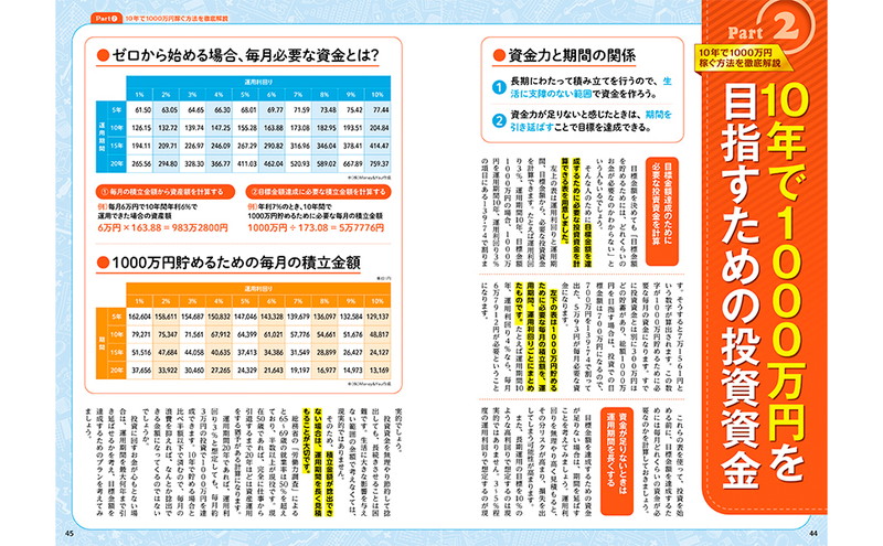 物価高で老後資金は4000万必要!? 焦らなくて大丈夫! 本誌では、投資の知識ゼロの初心者向けに、NISAを活用して10年で1000万円を稼ぐ方法を説明します。月に3万円、5万円のケースや貯金が100万円ある場合などのケース別に1000万円を貯めるに必要な毎月の積立金から想定利回りを算出し、どのように運用していけばよいかを具体的に解説。毎月の積立額をいくつかパターンを出し、積立額に応じた投資方法や元金が一定額ある場合の投資法などを紹介します。1000万円を貯めることができれば、その先の投資人生は大きく変わっていくこと間違いありません。本誌でまず第一歩を踏み出していきましょう!