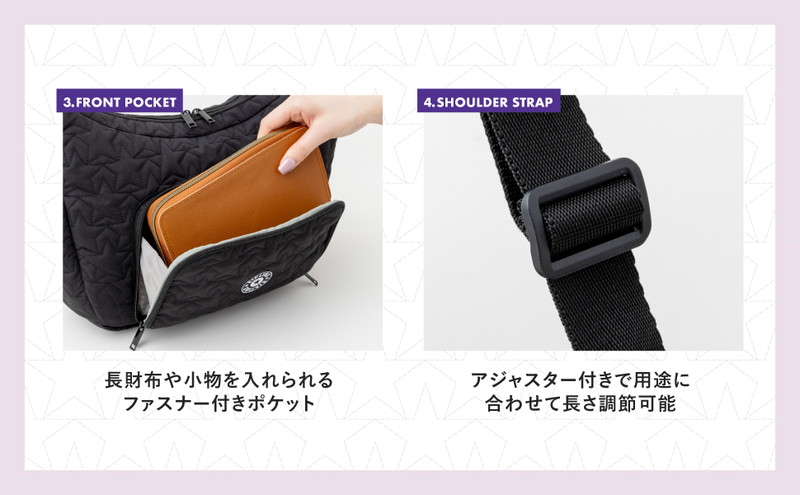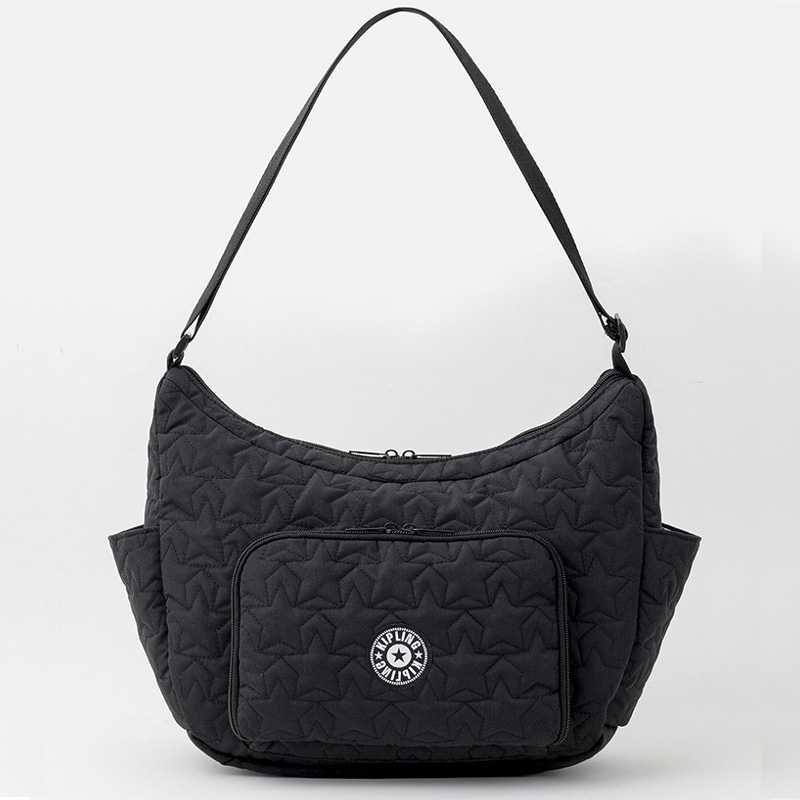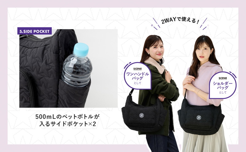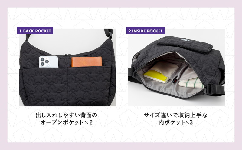 なめらかなカーブが印象的なハーフムーン型で、ブランドロゴがモチーフの星柄キルティングもアクセント。雑誌がラクラク入る大容量で、口が広い分荷物を出し入れしやすいのもうれしいポイント。